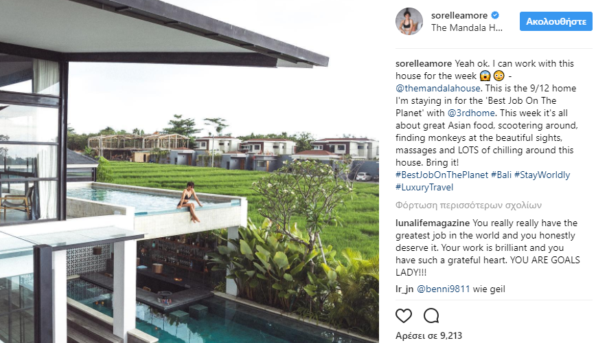 Πώς θα σας φαινόταν η ιδέα να περνάτε τον χρόνο σας ταξιδεύοντας σε όλον τον πλανήτη και να μένετε σε μερικά από τα πιο πολυτελή και εντυπωσιακά ξενοδοχεία στον κόσμο; Για την Σορέλε Αμόρε δεν πρόκειται απλώς για μία ιδέα ή ένα όνειρο. Αυτή είναι η καθημερινότητά της, καθώς κέρδισε στον διαγωνισμό «Best Job on the planet» (Η καλύτερη δουλειά στον πλανήτη) της εταιρείας Thirdhome και πλέον ζει ταξιδεύοντας σε εξωτικούς προορισμούς σε όλον τον κόσμο, λαμβάνοντας 10.000 δολάρια τον μήνα ως μισθό!