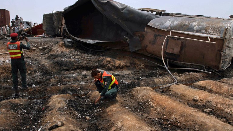 Το βυτιοφόρο είχε φορτώσει 40.000 λίτρα καυσίμου από το λιμάνι στο Καράτσι και τα μετέφερε στη Λαχόρη, την πρωτεύουσα της επαρχίας Πουντζάμπ. Ανατράπηκε καθώς προσπαθούσε να πάρει μια απότομη στροφή στο κεντρικό τμήμα της χώρας την περασμένη Κυριακή.