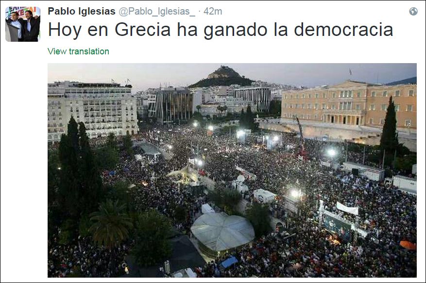 Ο επικεφαλής του ισπανικού κινήματος Podemos Πάμπλο Ιγκλέσιας δήλωσε ότι “η δημοκρατία νίκησε στην Ελλάδα”, με μήνυμά του στο Twitter.