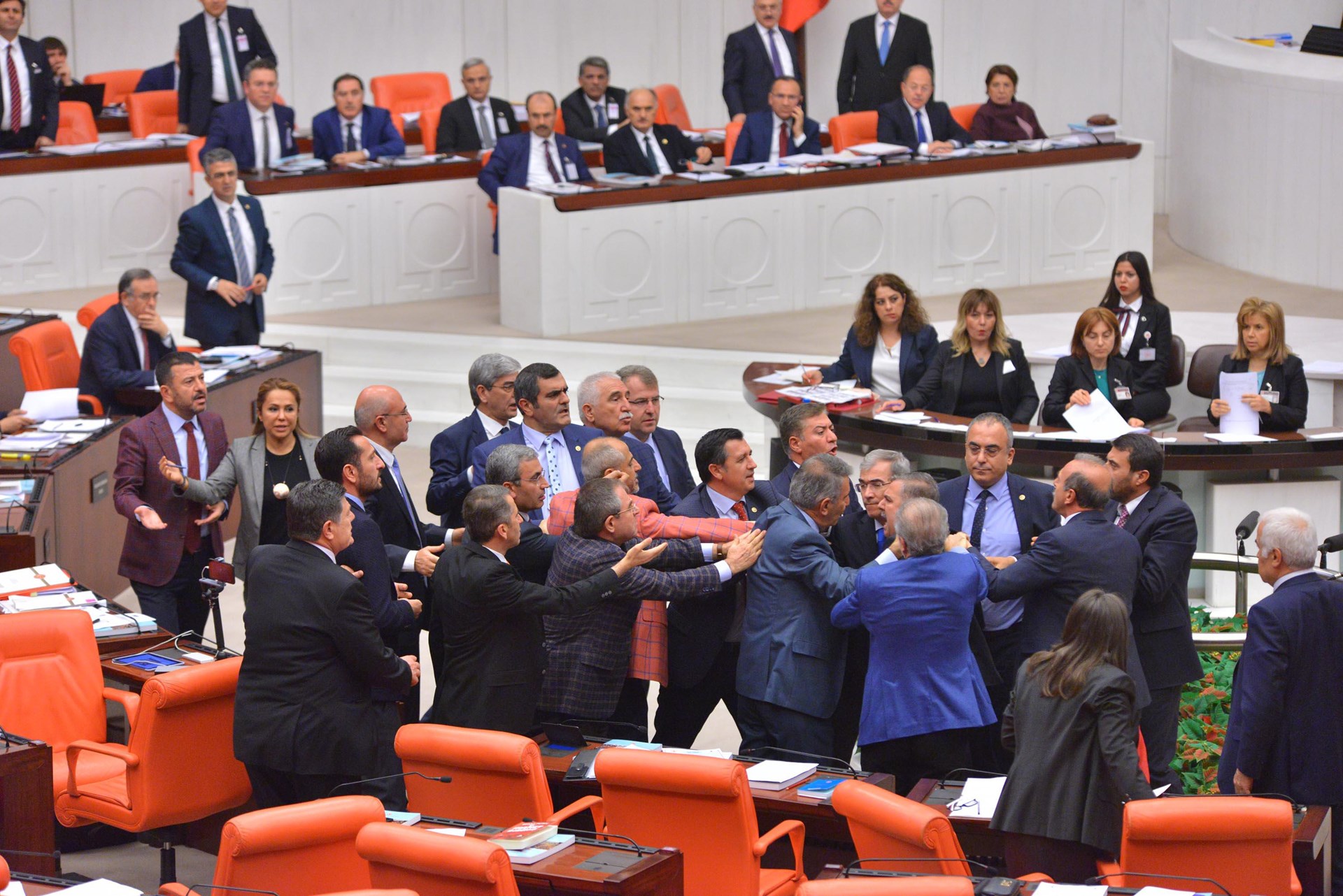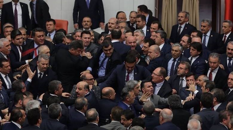 Βουλευτές του κυβερνώντος κόμματος (AKP), εισέβαλαν στο κέντρο της αίθουσας και πιάστηκαν στα χέρια, με τους βουλευτές του CHP, σπρώχνοντας ο ένας τον άλλον γύρω από το κεντρικό βήμα του Κοινοβουλίου.