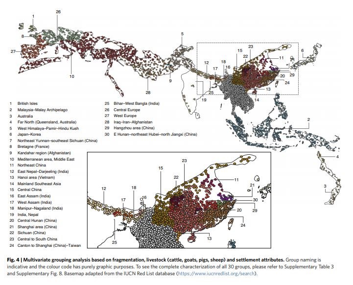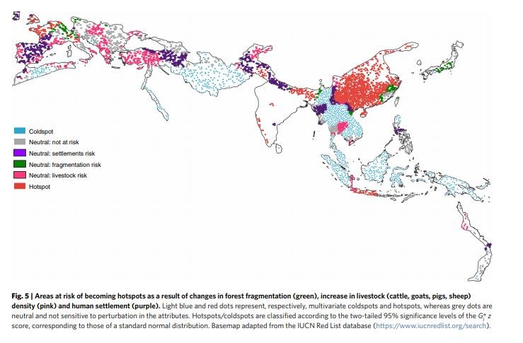 Πέρα από την Κίνα αλλά μεγάλα “hot spot” εντοπίζονται στην Τζάβα, στο Μπουτάν, στο ανατολικό Νεπάλ, στο βόρειο Μπαγκαλντές, στην πολιτεία της Κεράλα στην Ινδία και στη βορειοανατολική Ινδία. Αν και υπάρχουν χαμηλού κινδύνου “cold spot” στη νότια Κίνα, οι ερευνητές επισήμαναν πως μέρη της χώρας νότια της Σανγκάης, όπως και η Ιαπωνία και τα βόρεια των Φιλιππίνων κινδυνεύουν να γίνουν “hot spot” λόγω του περαιτέρω κατακερματισμού των δασών. Στο μεταξύ, μέρη της ηπειρωτικής νοτιοανατολικής Ασίας (Ινδοκίνα) και της Ταϊλάνδης ενδέχεται να μετατραπούν σε “hot spot” με την αύξηση της ζωικής παραγωγής, επισημαίνεται στη μελέτη, η οποία διενεργήθηκε από ερευνητές στο Πανεπιστήμιο της Καλιφόρνια, το Μπέρκλεϊ, το Πολυτεχνείο του Μιλάνου και το Πανεπιστήμιο Μάσεϊ της Νέας Ζηλανδίας και δημοσιεύθηκε στο Nature Food.