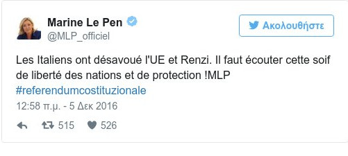 «Οι Ιταλοί αποκήρυξαν την ΕΕ και τον Ρέντσι. Πρέπει να ανταποκριθούμε σε αυτήν την δίψα για την ελευθερία των Εθνών και τον προστατευτισμό!» σημειώνει η επικεφαλής του Εθνικού Μετώπου της Γαλλίας.