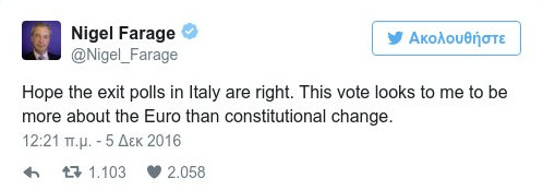 «Ελπίζω τα exit polls στην Ιταλία να είναι σωστά. Αυτή η ψήφος ήταν περισσότερο για την Ευρώπη παρά για την συνταγματική αλλαγή», ήταν η πρώτη αντίδραση του ο Νάιτζελ Φάρατζ.