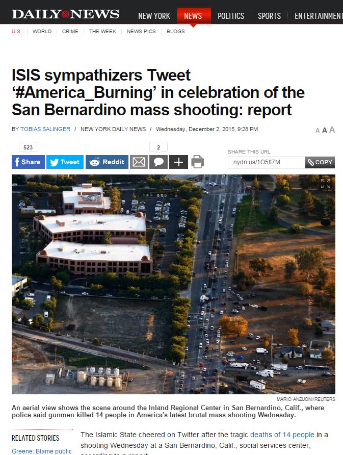 Πανηγυρίζει στο twitter το Ισλαμικό Κράτος για το αιματοκύλισμα στην Καλιφόρνια που είχε ως αποτέλεσμα το θάνατο 14 ανθρώπων.