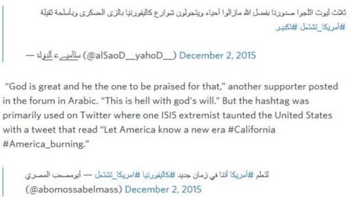 hashtag, #America_Burning στα Αραβικά. Μέχρι στιγμής δεν υπάρχει ανάληψη ευθύνης για την επίθεση στο Σαν Μπερναρντίνο της Καλιφόρνια.
