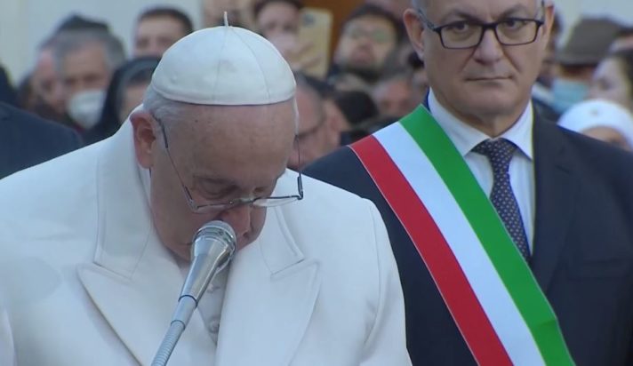 Ο Φραγκίσκος ξανάπιασε τότε το νήμα της ομιλίας, στηριζόμενος στο μπράτσο της πολυθρόνας του, αλλά παραμένοντας όρθιος: «… του ουκρανικού λαού για την ειρήνη που ζητάμε από τον Κύριο εδώ και κάποιον καιρό». «Πρέπει επίσης να σου μεταφέρω την ικεσία των παιδιών, των ηλικιωμένων, των πατέρων και των μητέρων, των νέων αυτής της μαρτυρικής γης που υποφέρει τόσο πολύ», συνέχισε, με φωνή τρεμάμενη από τη συγκίνηση.