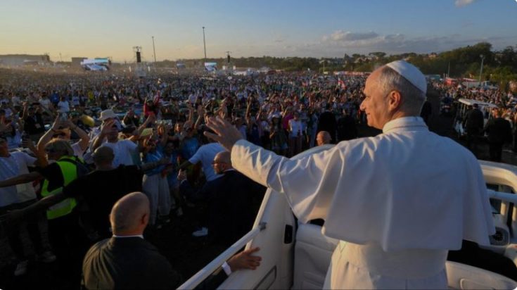 Massive crowds of young people welcoming Pope Leo XIV at Tor Vergata on the outskirts of Rome, over a million people, at tonight’s Prayer Vigil for the Jubilee of Youth.