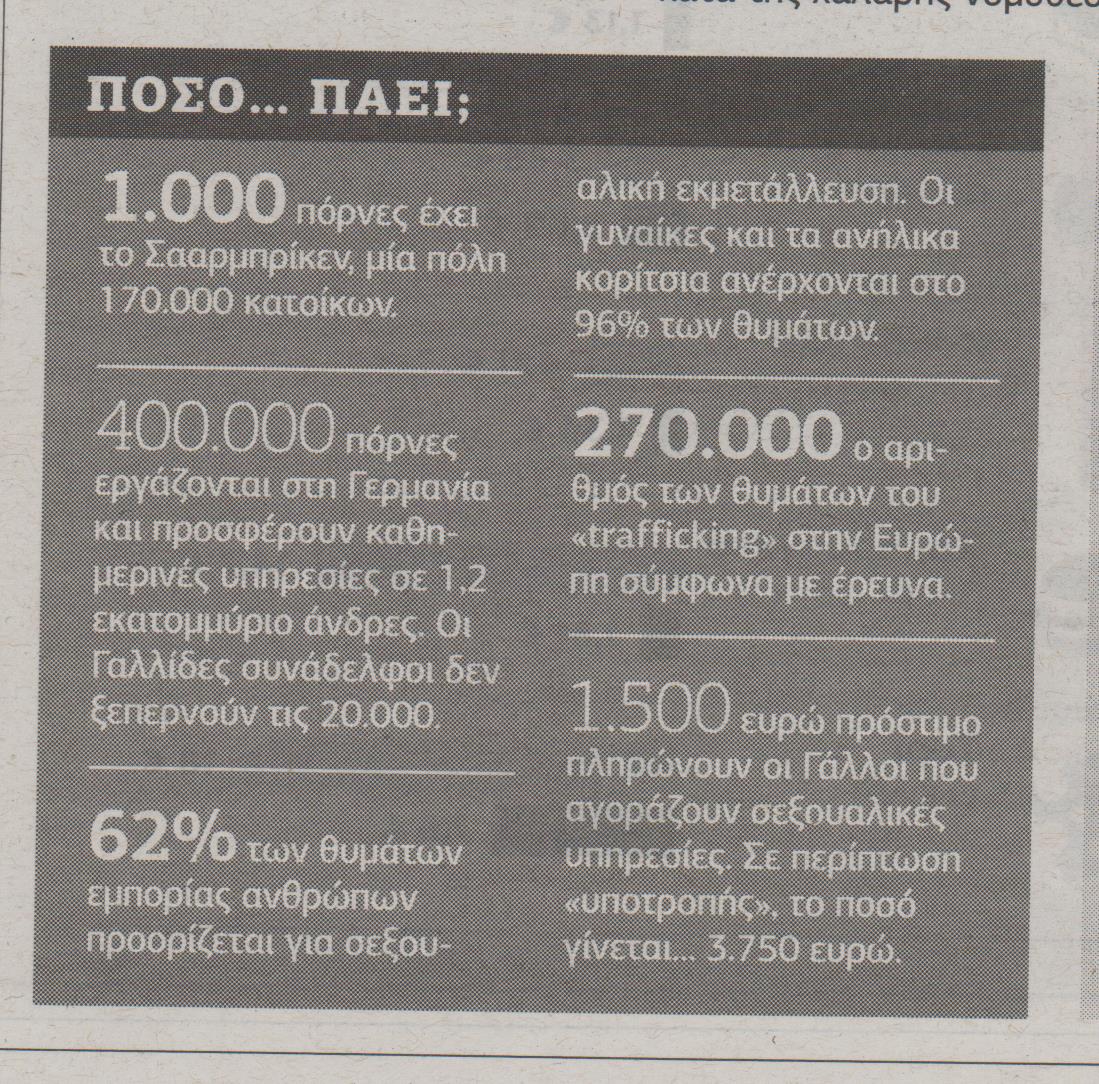 Το Σααρμπρίκεν, μία ήσυχη κατά τα άλλα πόλη 170.000 ανθρώπων, εγκαινιάζει αυτό το μήνα ένα ακόμη μεγα-πορνείο με 100 ιερόδουλες πλήρους απασχόλησης. Ονομάζεται «Παράδεισος», καλύπτει 1.400 τετραγωνικά μέτρα και οι εμπνευστές του ευελπιστούν ότι σύντομα θα γίνει πόλος έλξης για τους γείτονες Γάλλους. Κόστισε 4,5 εκατ. ευρώ και, όπως και τα μεγαλύτερα «αδέλφια» του με την υπογραφή της κοινοπραξίας Paradise Island Entertainment στο Μόναχο και τη Στουτγάρδη, διχάζει όχι μόνο τους ντόπιους, αλλά και ολόκληρη τη χώρα. Η Γερμανία νομιμοποίησε την πορνεία το 2002 και δημιούργησε μία βιομηχανία που αγγίζει τα 16 δισ. ευρώ, ετησίως.