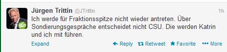 Κατά την πρώτη συνεδρίαση της νέας, 63μελούς κοινοβουλευτικής ομάδας των Πρασίνων στο Βερολίνο, ο Τριτίν ανακοίνωσε ότι δεν θα είναι εκ νέου υποψήφιος για την προεδρία, πρόσθεσε όμως ότι θα διευθύνει τις διαπραγματεύσεις των Πρασίνων με τους Χριστιανοδημοκράτες και τους Χριστιανοκοινωνιστές για το ενδεχόμενο να σχηματίσουν μια κυβερνητική συμμαχία.