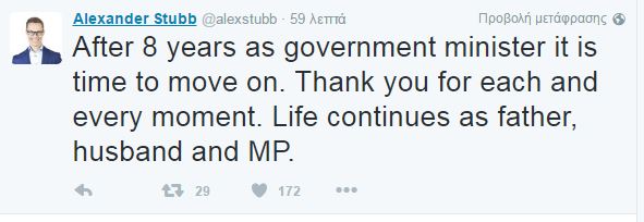 Την παραίτησή του ανακοίνωσε σήμερα, ο υπουργός Οικονομικών της Φινλανδίας Αλεξάντερ Στουμπ. Δείτε την ανάρτηση που έκανε στον προσωπικό του λογαριασμό στο Twitter ο Αλεξάντερ Στουμπ, με την οποία γνωστοποιεί την παραίτηση του από υπουργός Οικονομικών.