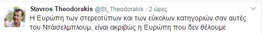 «Η Ευρώπη των στερεοτύπων και των εύκολων κατηγοριών σαν αυτές του Ντάισελμπλουμ, είναι ακριβώς η Ευρώπη που δεν θέλουμε» τόνισε ο Σταύρος Θεοδωράκης.