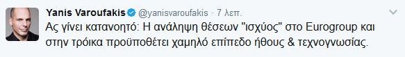 Το καρφί του Βαρουφάκη στον Ντάισελμπλουμ«Η ανάληψη θέσεων “ισχύος” στο Eurogroup και στην τρόικα προϋποθέτει χαμηλό επίπεδο ήθους και τεχνογνωσίας», έγραψε σε μήνυμά του στο Twitter o πρώην υπουργός Οικονομικών, Γιάνης Βαρουφάκης, σχολιάζοντας τις δηλώσεις του Προέδρου του Eurogroup, Γερούν Ντάισελμπλουμ, ότι οι χώρες της Νότιας Ευρώπης σπαταλούσαν χρήματα σε «ποτά και γυναίκες» στην πορεία προς την κρίση της Ευρωζώνης.Ο Γιάνης Βαρουφάκης έγραψε: «Ας γίνει κατανοητό: Η ανάληψη θέσεων “ισχύος” στο Eurogroup και στην τρόικα προϋποθέτει χαμηλό επίπεδο ήθους και τεχνογνωσίας».
