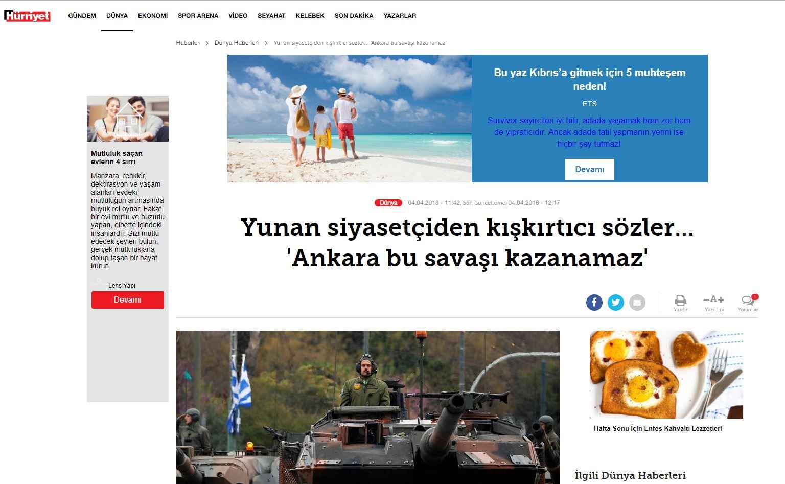 «Προκλητικός λόγος από Έλληνα πολιτικό: Η Άγκυρα δεν μπορεί να κερδίσει αυτόν τον πόλεμο», είναι ο τίτλος της Hurriyet.