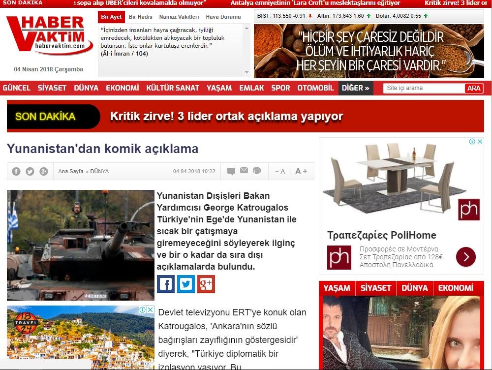 «Κωμική δήλωση στην Ελλάδα», τιτλοφορείται το ρεπορτάζ της ιστοσελίδας «habervaktim.com», ενώ στο ίδιο ύφος κινείται στον τίτλο της και η εφημερίδα «Milat» στην ηλεκτρονική της διεύθυνση. «Δήλωση που προκαλεί γέλιο στην Ελλάδα για την Τουρκία», αναφέρει χαρακτηριστικά το δημοσίευμα.