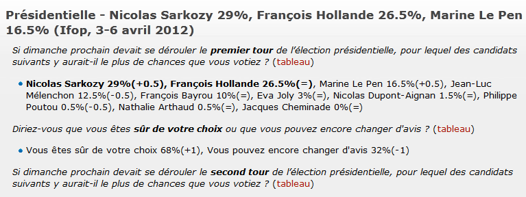 Πάρτυ πρέπει να κάνει ο Νικολά Σαρκοζί, καθώς για ακόμη μία φόρα κρατά τα ηνία της δημοσκόπησης με 29%, ενώ ο Φρανσουά Ολάντ βρίσκεται 3 βαθμούς πιο κάτω, με 26,5%.Ωστόσο, σταθερή στην τρίτη θέση παραμένει η Μαρί Λεπέν με ποσοστό 16,5%, ξεπερνώντας τον Μελενκόν, που βρίσκεται στην τέταρτη θέση κατά 4 μονάδες.