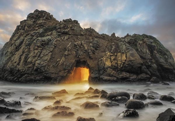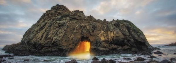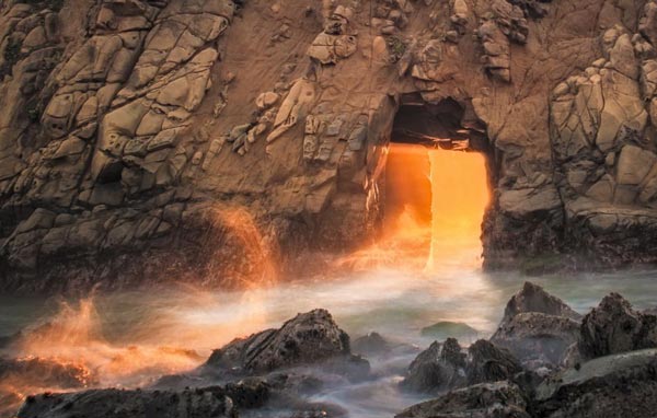 Ένα εκπληκτικό φως που εμφανίζεται στο Keyhole Arch, στην παραλία Pfeiffer της Καλιφόρνια μοιάζει να έρχεται κατευθείαν από ταινία του Ιντιάνα Τζόουνς! Κι όμως δεν πρόκειται για κάποιο εφέ, αφού αυτή η πορτοκαλί λάμψη που βλέπετε είναι ένα φυσικό φαινόμενο που συμβαίνει μόνο για μερικές εβδομάδες κάθε χρόνο, όταν ο ήλιος δύει στη σωστή γωνία και η παλίρροια είναι στο ενδεδειγμένο ύψος. Το σχεδόν υπερφυσικό φως στο Keyhole Arch λειτουργεί σαν μαγνήτης για τους φωτογράφους που επιθυμούν απεγνωσμένα να συλλάβουν την εκπληκτική λάμψη του.