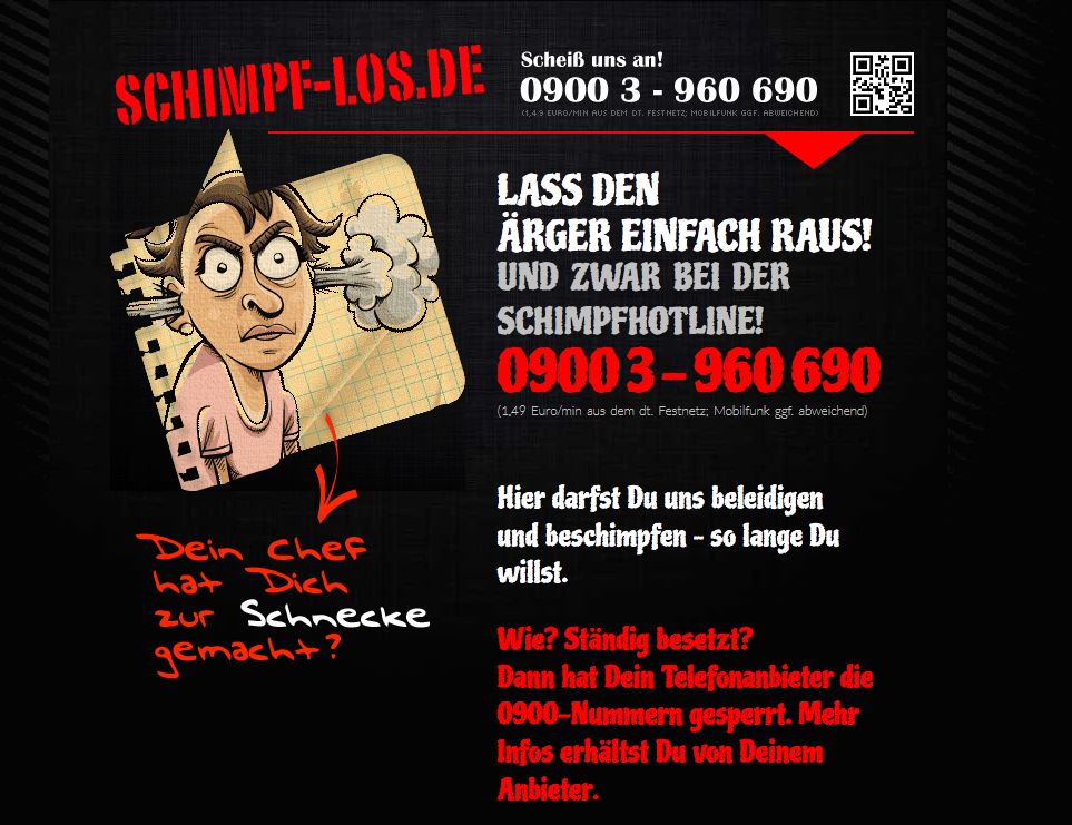 Έχετε νεύρα και θέλετε κάπου να ξεσπάσετε; Τη λύση μας δίνουν οι Γερμανοί δημιούργησαν που ένα τηλεφωνικό κέντρο, στο οποίο μπορούν να τηλεφωνούν ελεύθερα όλοι και να βρίζουν με την άνεσή τους.Οι εμπνευστές της συγκεκριμένης ιδέας, δηλώνουν ότι σκέφτηκαν να δημιουργήσουν μία γραμμή στην οποία ο κόσμος θα μπορούσε να απελευθερώσει το θυμό του και να μην ξεσπά σε συγγενείς και φίλους.Η κλήση κοστίζει 1,49 ευρώ το λεπτό, ενώ το προσωπικό όχι μόνο δεν συγκινείται απ’ όσα ακούει, αλλά είναι και εκπαιδευμένο ώστε να θυμώνει ακόμα περισσότερο τους Γερμανούς που τηλεφωνούν.Πώς το καταφέρνουν;Χρησιμοποιούν τις φράσεις: ”αυτή είναι η τρίτη φορά που ακούω κάτι τέτοιο”, ή ”έχεις απόλυτο δίκιο να νευριάζεις” και ”αυτά που λες δεν είναι τίποτα, που να ακούσεις τι μου είπε ο προηγούμενος”.Δείτε τη σελίδα του τηλεφωνικού κέντρου, που δημιούργησαν οι Γερμανοί