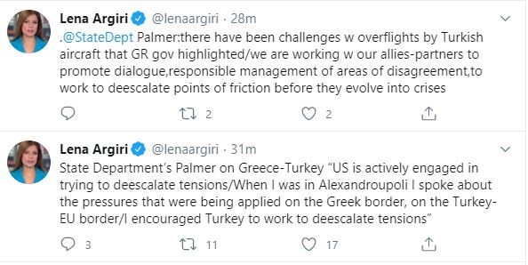 Σύμφωνα με τα όσα μετέδωσε μέσω Twitter η ανταποκρίτρια της ΕΡΤ στην Ουάσινγκτον, Λένα Αργύρη, το Στέιτ Ντιπάρτμεντ και συγκεκριμένα ο κ. Πάλμερ συστήνει στην Τουρκία να εργαστεί για την αποκλιμάκωση της έντασης στις σχέσεις της με την Ελλάδα.