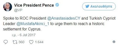 Ο κ. Πενς με tweet στον λογαριασμό του, λίγο αργότερα, αναφέρθηκε στις δύο τηλεφωνικές επαφές που είχε με Αναστασιάδη και Ακιντζί, προκειμένου να τους παροτρύνει να φτάσουν σε μια ιστορική διευθέτηση στο Κυπριακό.