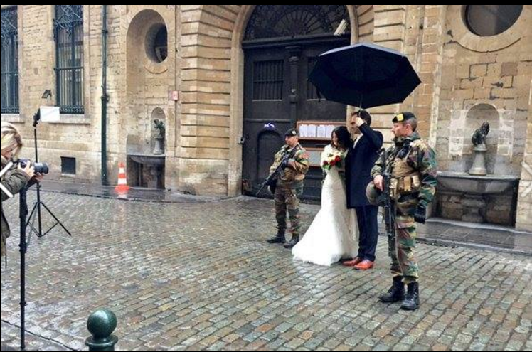 Ωστόσο η ζωή για τους Βέλγους συνεχίζεται όπως για το ζευγάρι που παντρεύτηκε πριν λίγες ώρες. Όμως το γαμήλιο άλμπουμ πέρα από τις συνηθισμένες φωτογραφίες θα έχει και υλικό με στρατιώτες.