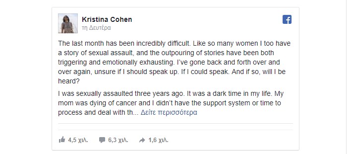 Σε ανάρτησή της στο Facebook, η Cohen περιγράφει αναλυτικά όσα της έκανε παρά τη θέλησή της ο Westwick. Όπως εξηγεί, αποφάσισε να μιλήσει τώρα για την περιπέτειά της, καθώς πήρε θάρρος και δύναμη από τις γυναίκες που καταγγέλλουν τον Harvey Weinstein. «Νιώθω αηδία βλέποντας άντρες όπως ο Ed να χαίρουν δημόσιου σεβασμού. Να τους παίρνουν συνεντεύξεις έγκριτες πλατφόρμες όπως η Oxford Union Society του Oxford University, όπου και τιμήθηκε ως ένας από τους «Ανθρώπους που Διαμόρφωσαν τον Κόσμο Μας» . Πώς θα τελειώσει αυτό; Άντρες όπως ο Ed χρησιμοποιούν τη φήμη και τη δύναμή τους για να βιάζουν και να εκφοβίζουν αλλά συνεχίζουν να συλλέγουν βραβεία», γράφει στην ανάρτησή της στη σελίδα κοινωνικής δικτύωσης.