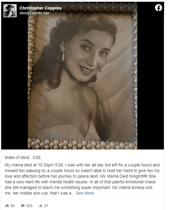 Η 85χρονη πέθανε στις 26 Μαΐου. «Ήμουν μαζί της όλη την ημέρα αλλά έφυγα για μερικές ώρες και έχασα τις τελευταίες της στιγμές, οπότε δεν μπόρεσα να κρατήσω το χέρι της για να της δώσω την αγάπη μου πριν από το ταξίδι της στην ειρηνική γη» έγραψε, δημοσιεύοντας και μια φωτογραφία της μαμάς του από τα νιάτα της.