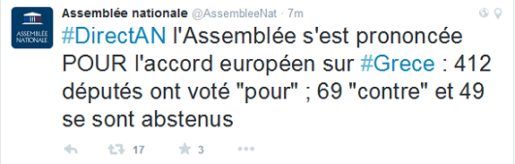 Συγκεκριμένα 412 βουλευτές ψήφισαν υπέρ, 69 κατά και 49 απείχαν από την ψηφοφορία. Να σημειωθεί ότι η Γαλλία είναι η πρώτη χώρα που ενέκρινε το πακέτο βοήθειας για τη χώρα μας.