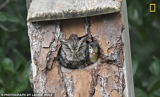 Όταν όμως έφθασε κοντά για να πάρει τη φωτογραφία, είδε ένα χαριτωμένο κίτρινο πουλάκι να βρίσκεται μέσα στη φωλιά. Επρόκειτο για ένα παπάκι που η κουκουβάγια το μεγαλώνει σαν παιδί της. Η Λόρι Γουλφ του πρακτορείου Jupiter είπε στο National Geographic ότι οι δυο τους κάθονταν δίπλα δίπλα και είναι ένα θέαμα που είναι απίστευτο.