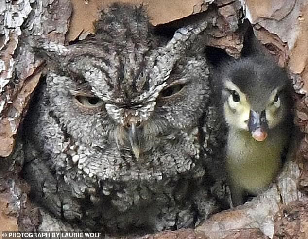Όταν όμως έφθασε κοντά για να πάρει τη φωτογραφία, είδε ένα χαριτωμένο κίτρινο πουλάκι να βρίσκεται μέσα στη φωλιά. Επρόκειτο για ένα παπάκι που η κουκουβάγια το μεγαλώνει σαν παιδί της. Η Λόρι Γουλφ του πρακτορείου Jupiter είπε στο National Geographic ότι οι δυο τους κάθονταν δίπλα δίπλα και είναι ένα θέαμα που είναι απίστευτο.
