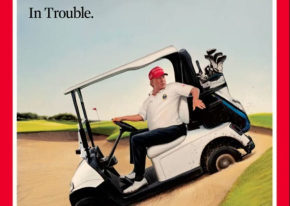Το εξώφυλλο δείχνει τον Ντόναλντ Τραμπ να έχει πέσει σε έναν λάκκο με άμμο μαζί με το μπαλάκι του γκολφ και να προσπαθεί να βγει με την όπισθεν πάνω σε ένα αμαξίδιο του γκολφ. «Σε μπελάδες» γράφει ο τίτλος της εικόνας.