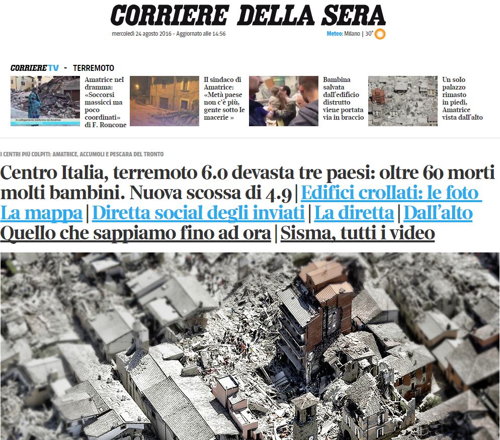 Σε περισσότερους από 60 ανέρχονται οι νεκροί από τον σεισμό που έπληξε σήμερα πριν από τα χαράματα την κεντρική Ιταλία, σύμφωνα με τον ιστότοπο της ιταλικής εφημερίδας Corriere della Sera.
