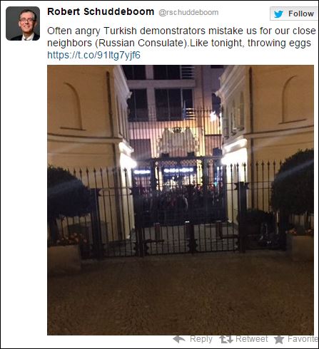 «Οργισμένοι Τούρκοι διαδηλωτές μας μπερδεύουν συχνά με τους γείτονές μας (το ρωσικό προξενείο). Όπως απόψε που πέταξαν αυγά» εναντίον μας, σχολίασε με σκωπτική διάθεση, ο γενικός πρόξενος της Ολλανδίας Ρόμπερτ Σούντεμπουμ στον λογαριασμό του στον ιστότοπο κοινωνικής δικτύωσης Twitter.
