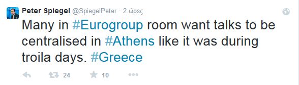 Τη συνεδρίαση του Eurogroup σχολίασε ο δημοσιογράφος των Financial Times, Peter Spiegel, με ανάρτηση που έκανε στο προσωπικό του λογαριασμό στο Twitter. Συγκεκριμένα, έγραψε: “Πολλοί από αυτούς που βρίσκονταν στην αίθουσα του Eurogroup, θέλουν να συνεχιστούν οι συνομιλίες στην Αθήνα, όπως γίνονταν επί των ημερών της τρόικας“.