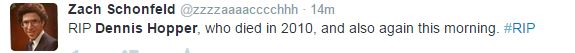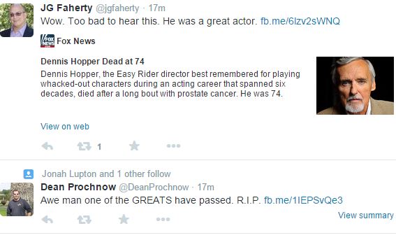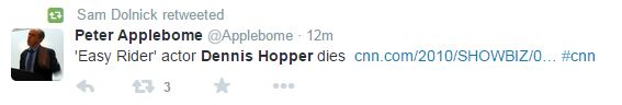 Όλα ξεκίνησαν όταν ο βετεράνος δημοσιογράφος και αναπληρωτής εκδότης των New York Times, Peter Applebome, έγραψε στον λογαριασμό του στο twiiter ότι ο Dennis Hopper πέθανε, παραπέμποντας στην σχετική είδηση στο CNN. Όμως, αυτό που δεν πρόσεξε όμως ο δημοσιογράφος είναι η ημερομηνία της ανάρτησης του CNN.