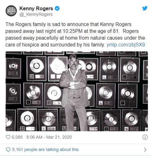 Πέθανε ο Κένι Ρότζερς σε ηλικία 81 ετών. Ο Ρότζερς ήταν ένα από τα μεγαλύτερα αστέρια της country μουσικής. Άφησε την τελευταία του πνοή την Παρασκευή το βράδυ και η οικογένεια του έκανε την ανακοίνωση από τον λογαριασμό του τραγουδιστή στο twitter. Οι πιο μεγάλες του επιτυχίες ήταν τα τραγούδια “The Gambler,” “Lady,” “Islands in the Stream,” και “Lucille”. Όπως αναφέρει η ανακοίνωση ο Ρότζερς πέθανε στο σπίτι του από φυσικά αίτια στις 22:25. Ο 81χρονος ήταν υπό την φροντίδα νοσοκόμας, και στο πλευρό του ήταν όλη η οικογένεια. Η καριέρα του κράτησε για περισσότερα από 60 χρόνια και άφησε ανεξίτηλο σημάδι στην αμερικανική μουσική.