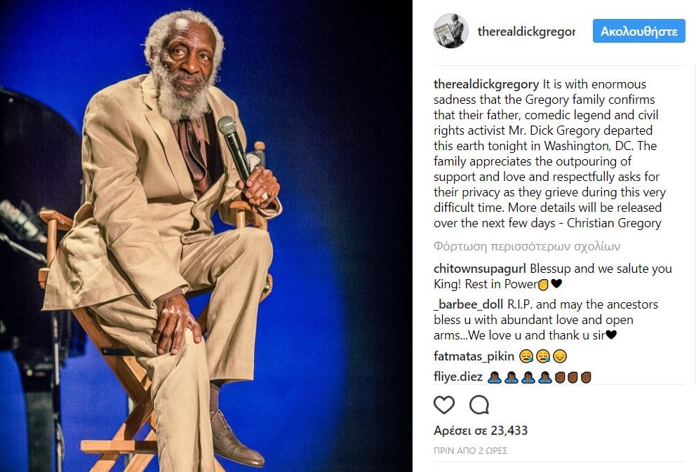 “Με απέραντη λύπη η οικογένεια Γκρέγκορι επιβεβαιώνει πως ο πατέρας μας, ο κωμικός θρύλος και ακτιβιστής για τα ανθρώπινα δικαιώματα, ο Ντικ Γκρέγκορι,’έφυγε’ απόψε στην Ουάσινγκτον”, έγραψε ο γιος του, Κρίστιαν, στο Instagram.