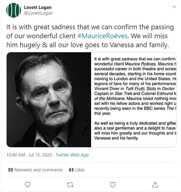 Σε δήλωσή τους οι ατζέντηδές του εκφράζουν τη θλίψη τους για τον χαμό το επιβεβαιώνοντας τον θάνατό του. Επισημαίνουν ότι είχε μία λαμπερή καριέρα σε θέατρο και κινηματογράφο ενώ ξεκίνησε από τη Σκωτία και βρέθηκε σε Λονδίνο και ΗΠΑ.