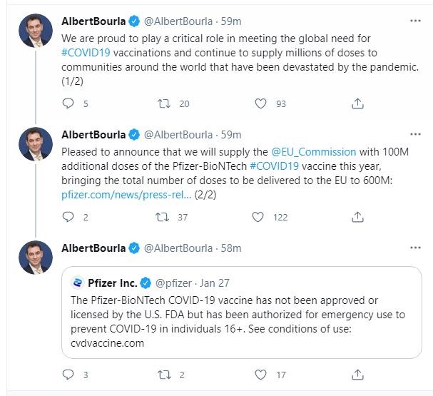 Ο ίδιος ο CEO της Pfizer Άλμπερτ Μπουρλά με ανάρτησή του στο twitter γνωστοποίησε τη συμφωνία σημειώνοντας: “Είμαστε περήφανοι που διαδραματίζουμε κρίσιμο ρόλο στην κάλυψη της παγκόσμιας ανάγκης για εμβόλια κατά της Covid-19 και συνεχίζουμε να προμηθεύουμε εκατομμύρια δόσεις τις κοινότητες σε ολόκληρο τον κόσμο που έχουν συντριβεί από την πανδημία. Με 100 εκατ. επιπλέον δόσεις του εμβολίου των Pfizer-BioNTech αυτό το έτος, ο συνολικό αριθμός δόσεων που διαθέτουμε στην ΕΕ αγγίζει τις 600 εκατ. δόσεις.