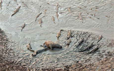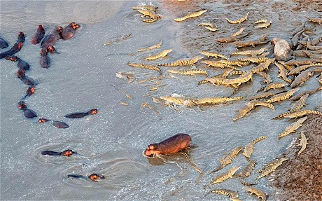 Ένα σπάνιο περιστατικό κατέγραψε με τον φακό του ο φωτογράφος του Mercury Press, Μαρκ Μολ. Περισσότεροι από 100 κροκόδειλοι επιτέθηκαν σε μια ομάδα ιπποπόταμων σε ποταμό της Ζάμπια. Όπως ανέφερε ο φωτογράφος οι ιπποπόταμοι δεν είχαν καμία διάθεση για να μονομαχήσουν και το μόνο που τους ενδιέφερε ήταν να… γλιτώσουν από τα σαγόνια των ερπετών και τα κατάφεραν. Ο Μολ απαθανάτισε έναν νεκρό ιπποπόταμο, ο θάνατος του οποίου δεν είχε σχέση με την επίθεση των κροκόδειλων.