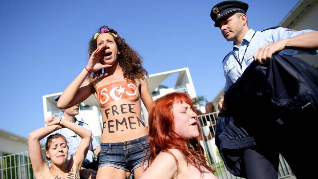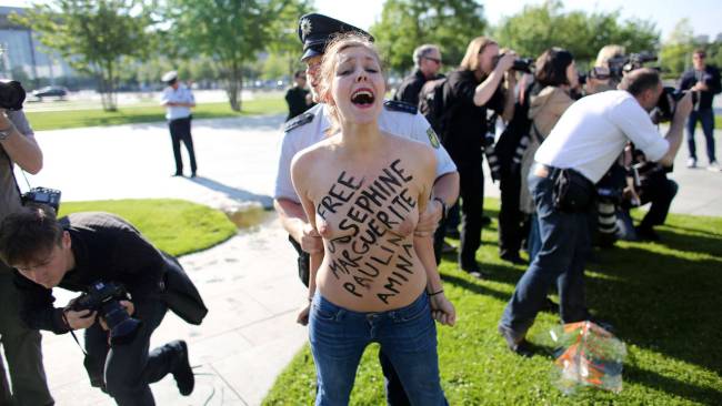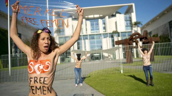 Τρία μέλη της ακτιβιστικής οργάνωσης FEMEN επιχείρησαν να εισβάλλουν στην Καγκελαρία. Άγνωστο παραμένει αν η Άγκελα Μέρκελ ήταν εντός. Η διαμαρτυρία τους όμως έφτασε μέχρι τον προαύλιο χώρο, αφού η αστυνομία ανέλαβε την απομάκρυνσή τους.