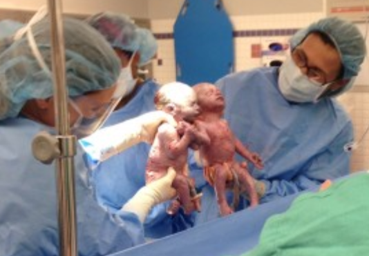Οι γιατροί στο Οχάιο δεν πίστευαν στα μάτια τους. Μετά την πρώτη ανησυχία για την ασφάλεια των δύο βρεφών -μια και τέτοια δίδυμα κύηση συμβαίνει μία στις 10.000 περιπτώσεις κι έχει μεγάλη δυσκολία εξαιτίας της πιθανότητας οι ομφάλιοι λώροι να είναι μπερδεμένοι-, οι γιατροί εξεπλάγησαν από τη στάση στην οποία τα δύο μωράκια βρίσκονταν.