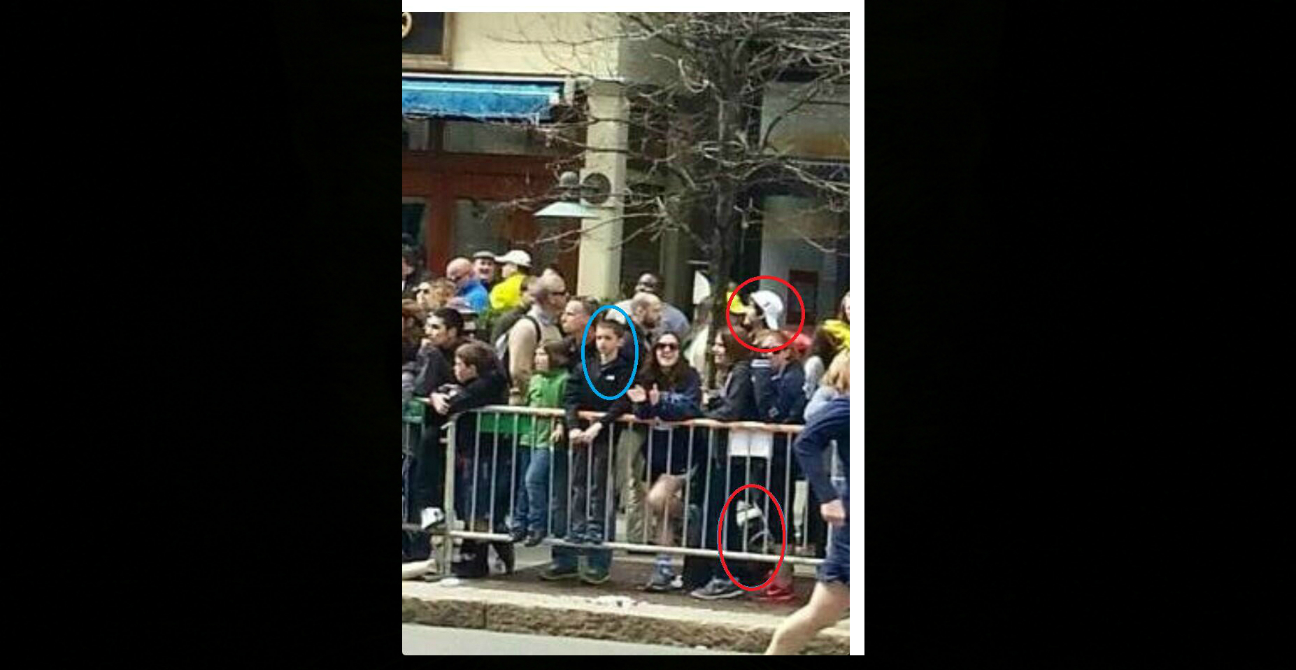 Ο νεαρός άντρας με το λευκό καπέλο φέρεται, σύμφωνα με μια φωτογραφία που έδωσε η αστυνομία στην δημοσιότητα, μα στέκεται δίπλα στον 8χρονο Μάρτιν που σκοτώθηκε από την έκρηξη περιμένοντας τον πατέρα του στον τερματισμό.