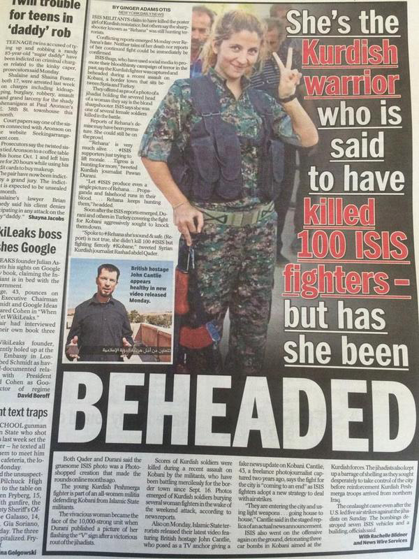 Στο διαδίκτυο κυκλοφορεί και μια φωτογραφία ενός αποκεφαλισμένου κοριτσιού που φέρεται να είναι η 25χρονη Rehana. Την ίδια ώρα όμως, οι Πεσμεργκά επιμένουν ότι η κοπέλα είναι ζωντανή και συνεχίζει να μάχεται κατά του Ισλαμικού Κράτους.