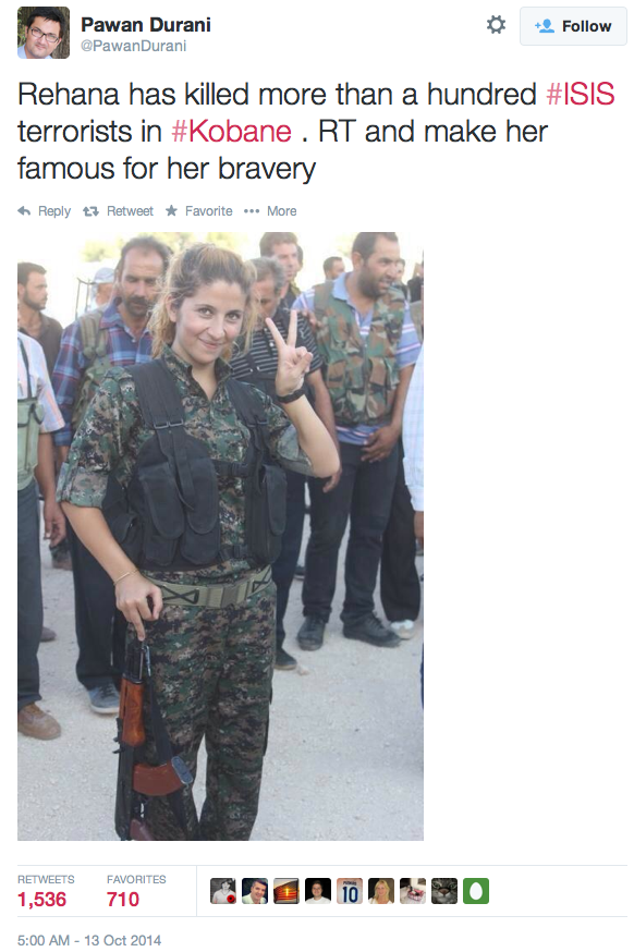 Μυστήριο καλύπτει το τι έχει πραγματικά συμβεί στο κορίτσι σύμβολο των Πεσμεργκά που φέρεται να έχει σκοτώσει 100 τζιχαντιστές. Η Rehana, η 25χρονη μαχήτρια των Πεσμεργκά που την φωνάζουν για το θάρρος αλλά και την ομορφιά της «άγγελο» του Κομπάνι, είναι νεκρή σύμφωνα με τζιχαντιστές που ισχυρίζονται ότι την αποκεφάλισαν.