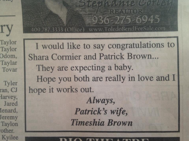 Να συγχαρεί ή να εκθέσει ήθελε η σύζυγος που έσπευσε να δημοσιεύσει στην εφημερίδα την εγκυμοσύνη μιας άλλης γυναίκας και να ευχηθεί τα καλύτερα;