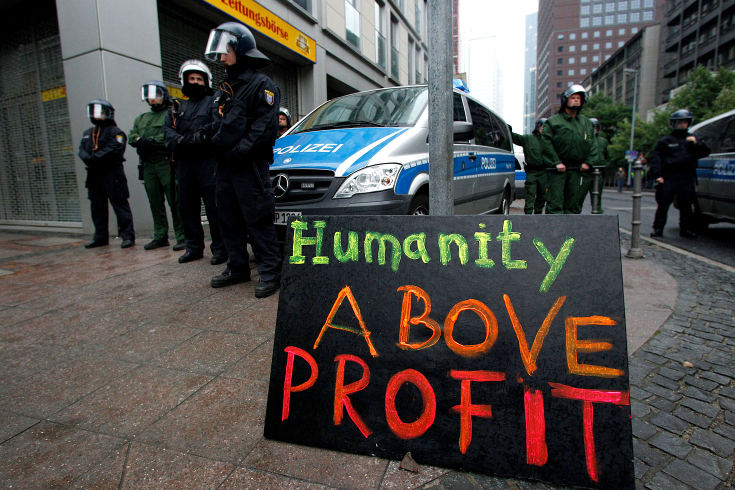 Κρατώντας πλακάτ με συνθήματα όπως «η ανθρωπότητα πάνω από τα κέρδη», οι διαδηλωτές συγκεντρώθηκαν παρά τη σφοδρή βροχόπτωση, αποκλείοντας δρόμους που οδηγούν στην ΕΚΤ, καθώς και στην έδρα της Deutsche Bank.