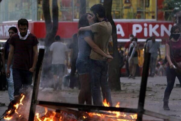 Τον γύρο του διαδικτύου κάνει φωτογραφία κατά τη διάρκεια των διαδηλώσεων στην πλατεία Ταξίμ της Κωνσταντινούπολη, η οποία απεικονίζει ένα νεαρό ζευγάρι να φιλιέται μπροστά στις φλόγες, δίνοντας το δικό του μήνυμα για τον αγώνα του λαού της Τουρκίας.