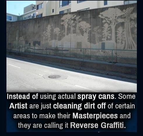 Το «αντίστροφο γκράφιτι» ή «reverse graffiti» αντί να «λερώνει» αν θεωρήσουμε ότι τα graffiti λερώνει, καθαρίζει. Η νέα τέχνη που εξαπλώνεται με ταχύτητα βασίζεται στην καθαριότητα σημείων που είναι λερωμένα από σκόνη και καυσαέρια που συσσωρεύτηκαν στο πέρασμα του χρόνου. Όλοι όταν ήμασταν παιδιά είχαμε γράψει ή ζωγραφίσει πάνω στο παρμπρίζ ενός λερωμένου αυτοκινήτου… Ακριβώς πάνω σε αυτή την ιδέα στηρίζεται το reverse graffiti.