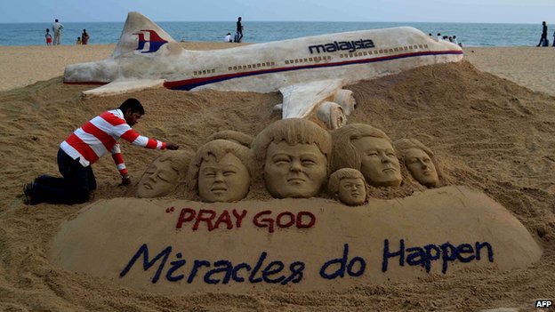 «Προσευχηθείτε στον Θεό. Τα θαύματα πράγματι συμβαίνουν» γράφει στο έργο που δημιούργησε στην άμμο ο Ινδός καλλιτέχνης άμμο Sudarshan Patnaik. Σε μια προσπάθεια να ευαισθητοποιήσει τον κόσμο για τους 239 επιβαίνοντες τους αεροσκάφους της Malaysian Airlines που αγνοείται, ο διάσημος καλλιτέχνης έφτιαξε ένα γλυπτό στην άμμο που απεικονίζει τους επιβάτες αλλά και ολόκληρο το αεροσκάφος.