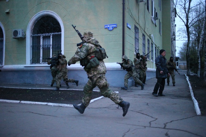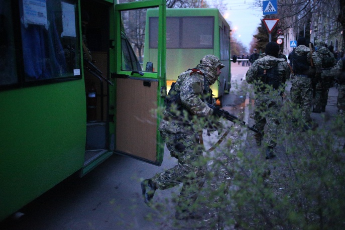 Εντυπωσιακές εικόνες με Ρώσους οπλισμένους στρατιώτες, να καταλαμβάνουν το αστυνομικό τμήμα της πόλης Κράματορσκ της Ουκρανίας.